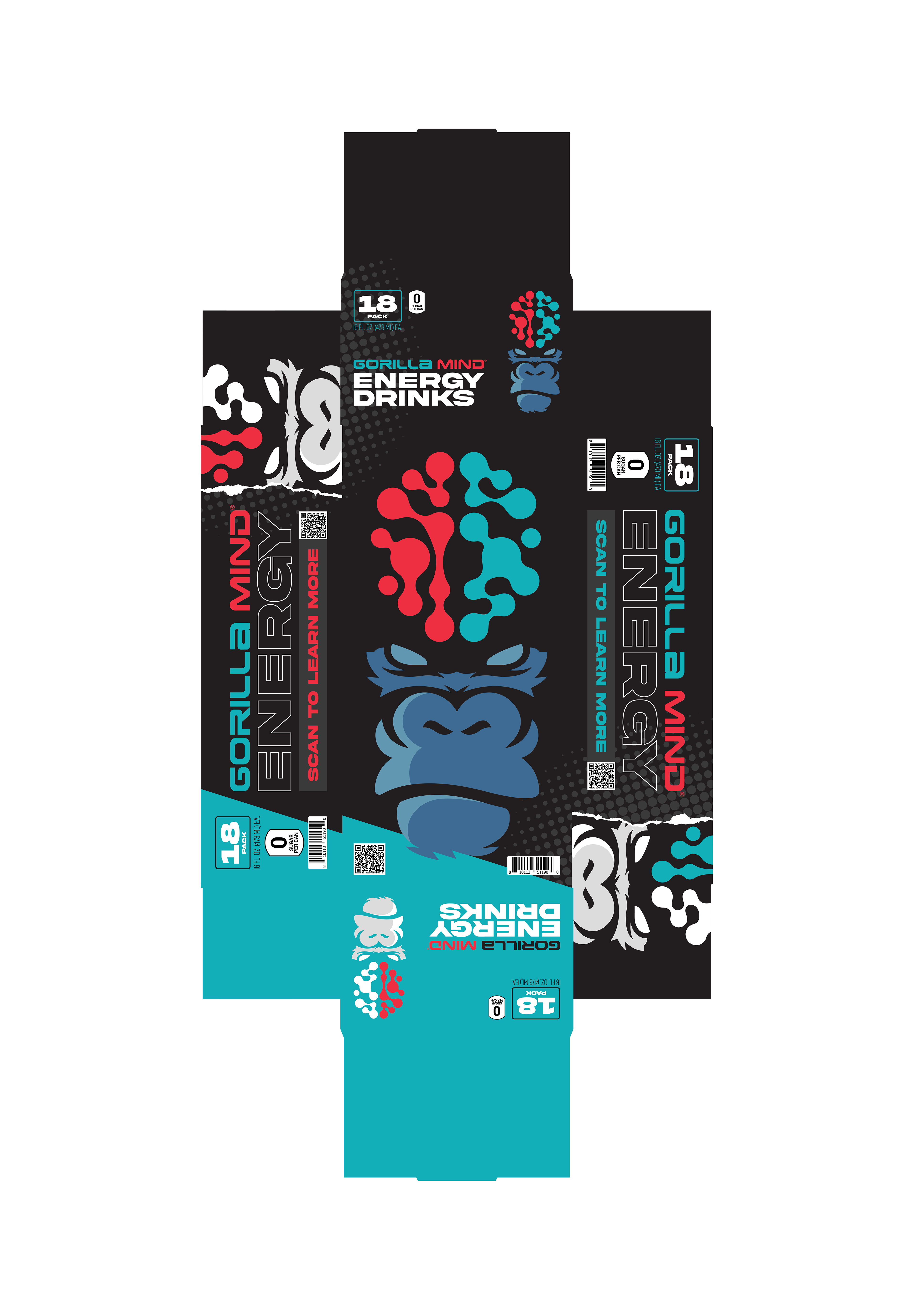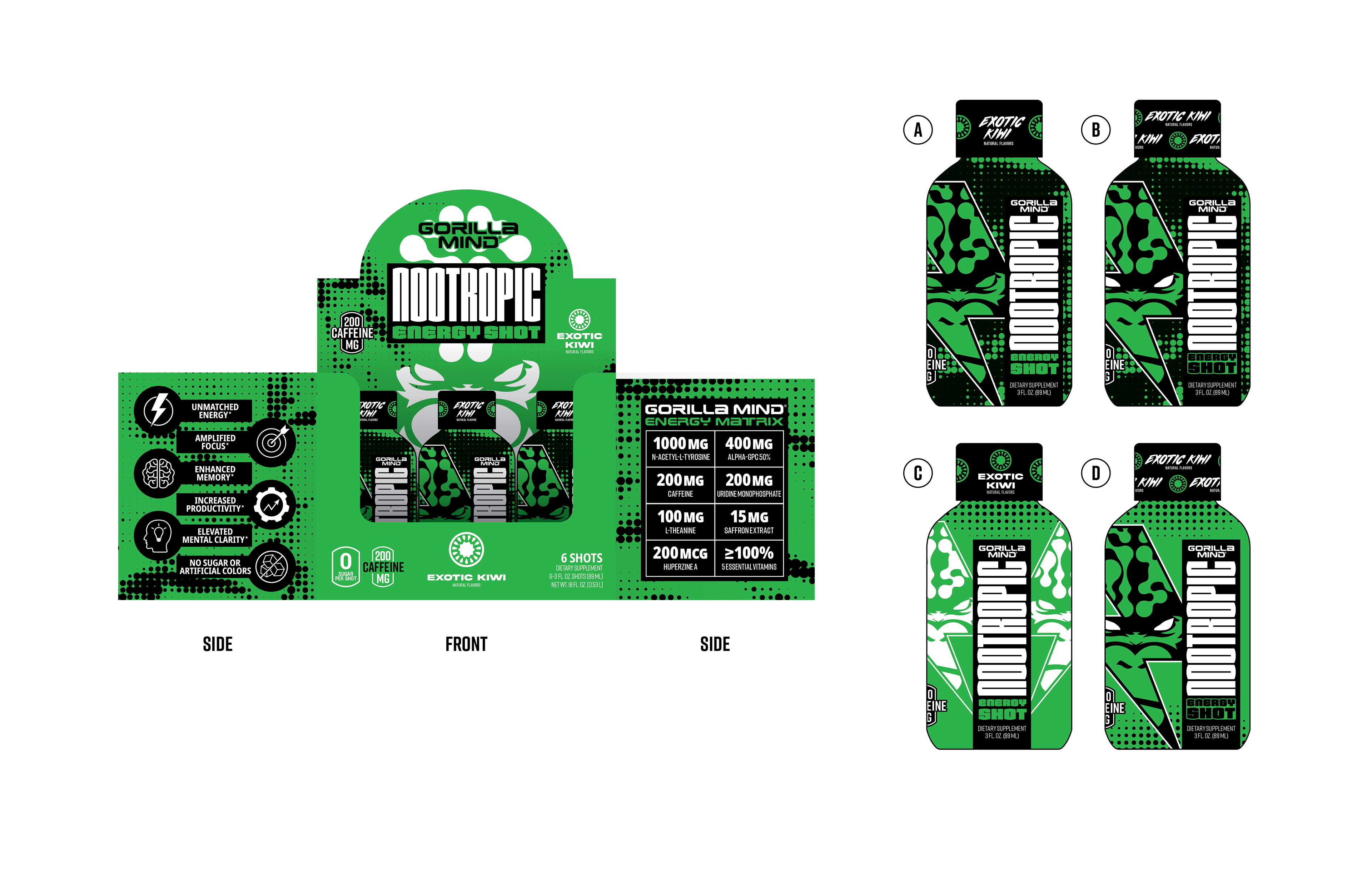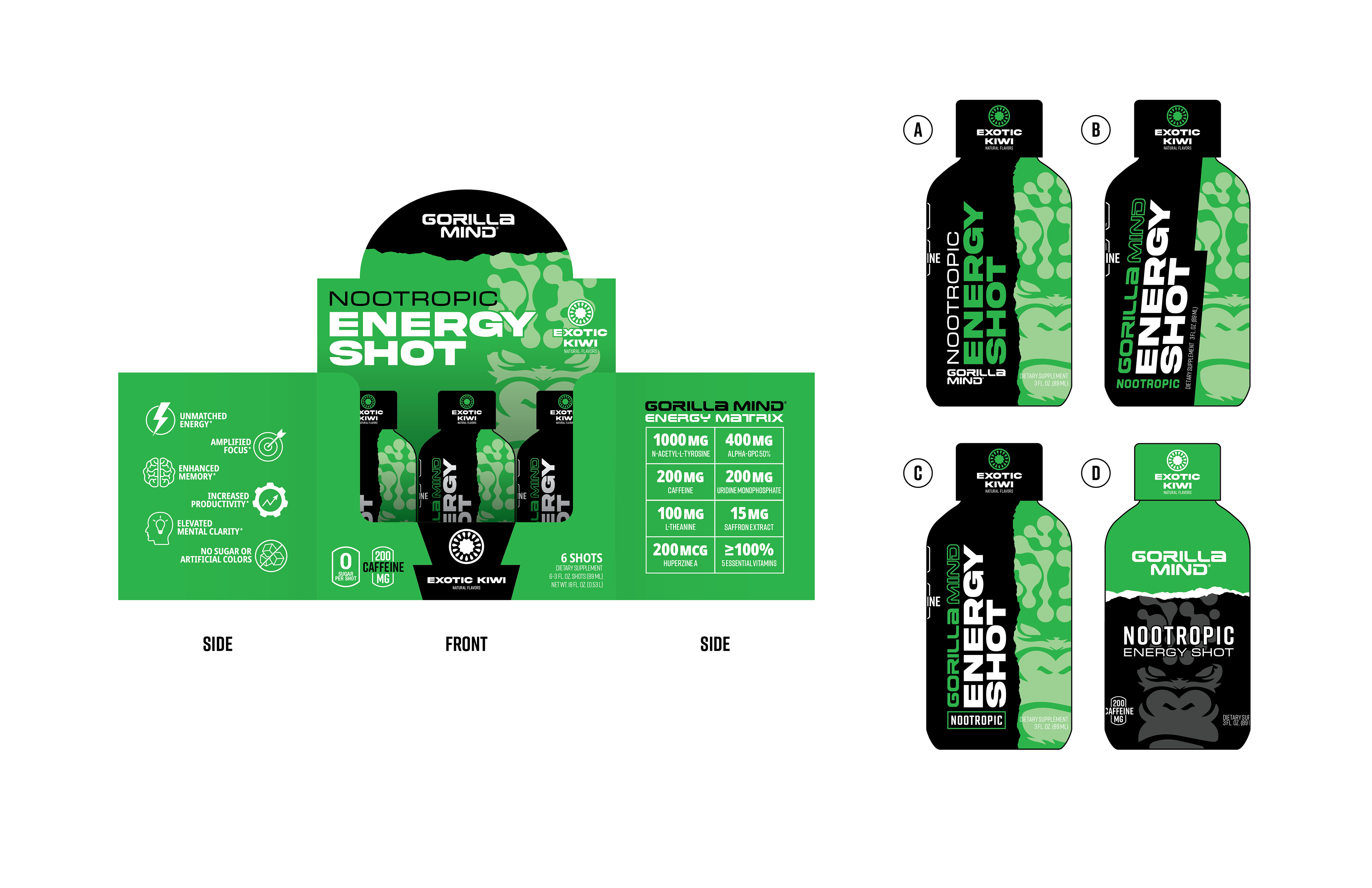 Designed a wide range of Gorilla Mind packaging across formats and retail environments, including 12-pack and 18-pack club packaging for Costco, whey protein, and creatine gummies with tactile finishing explorations. Led concept development for energy shot sleeves and boxes, balancing shelf impact, scalability, and premium production details.
