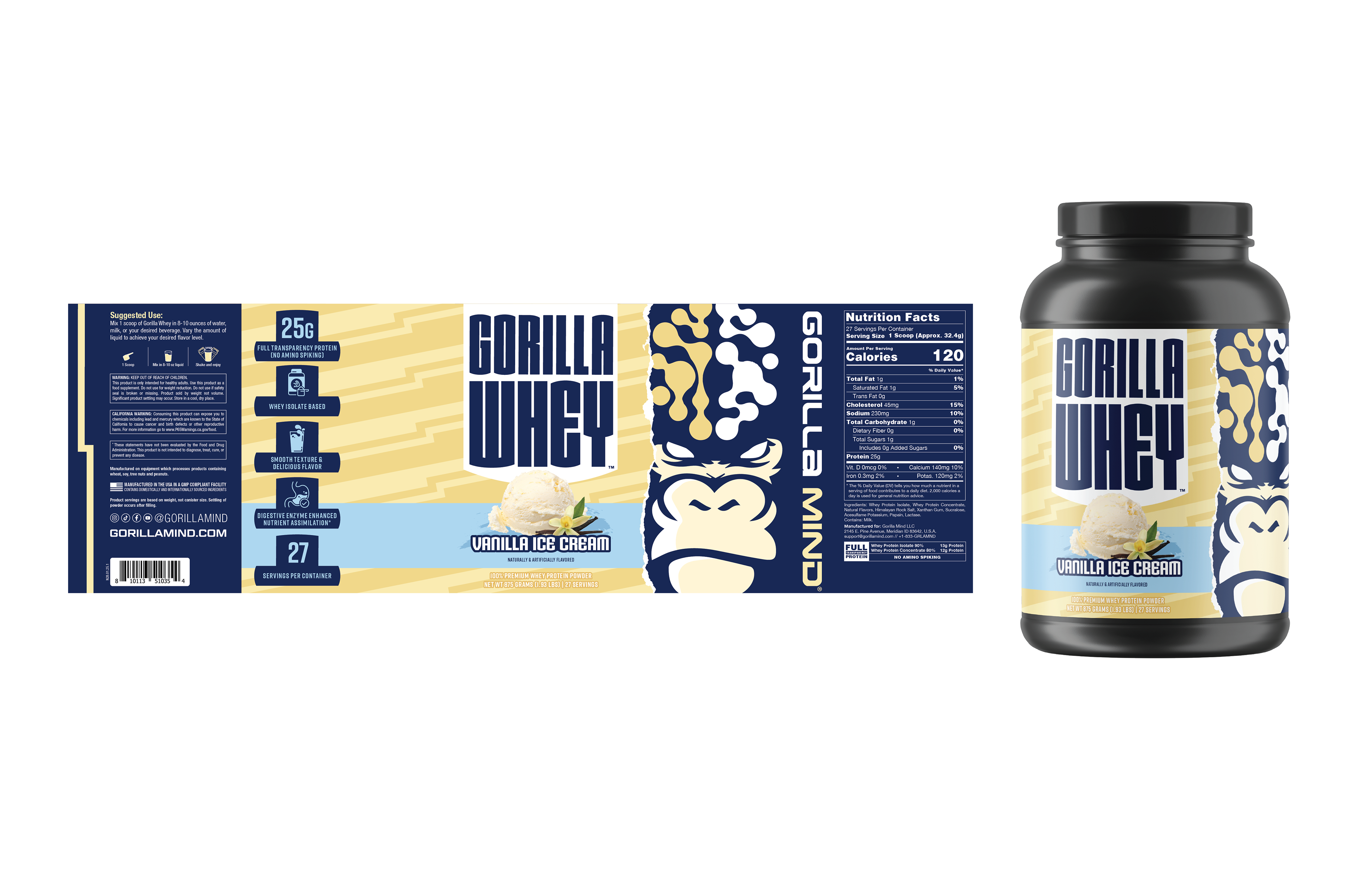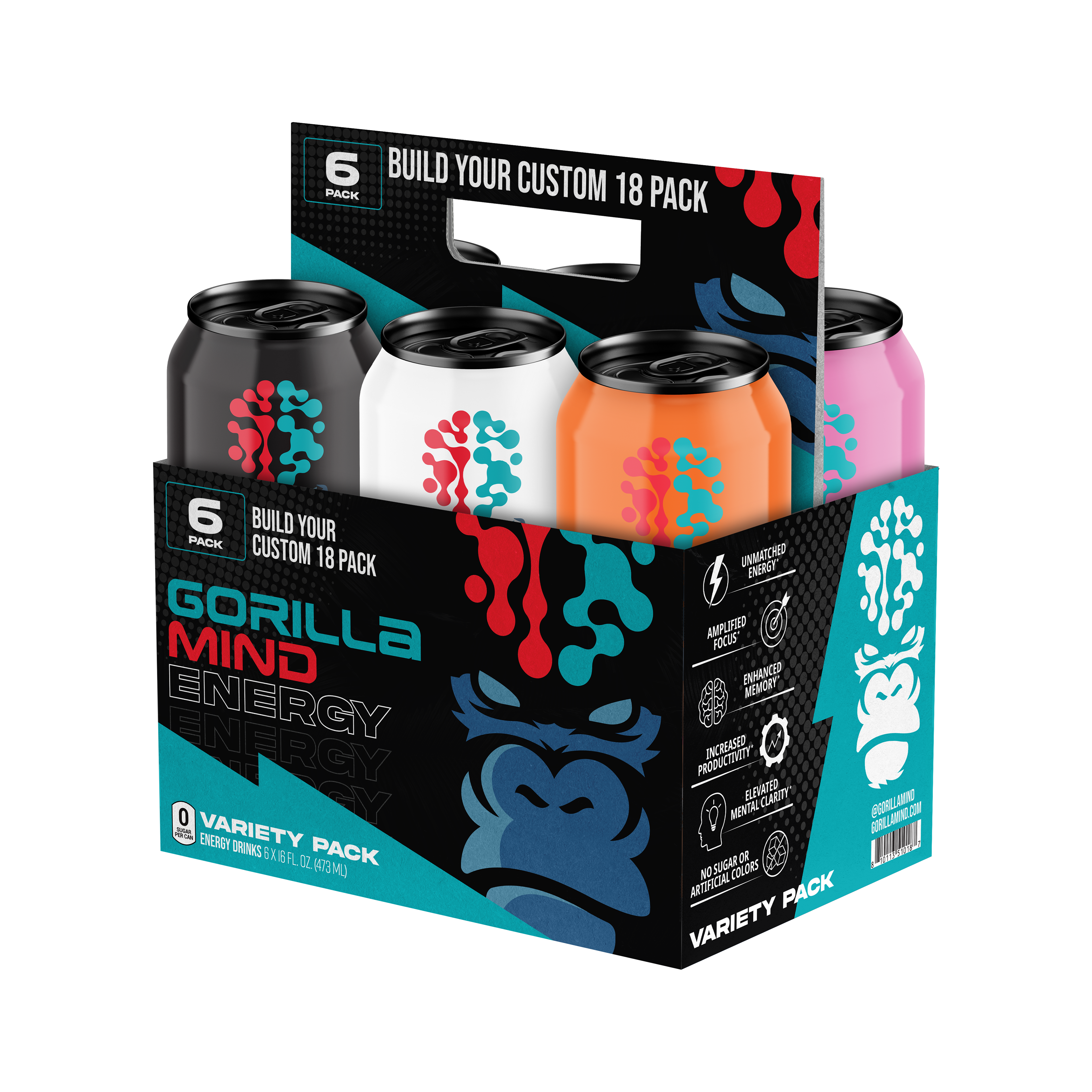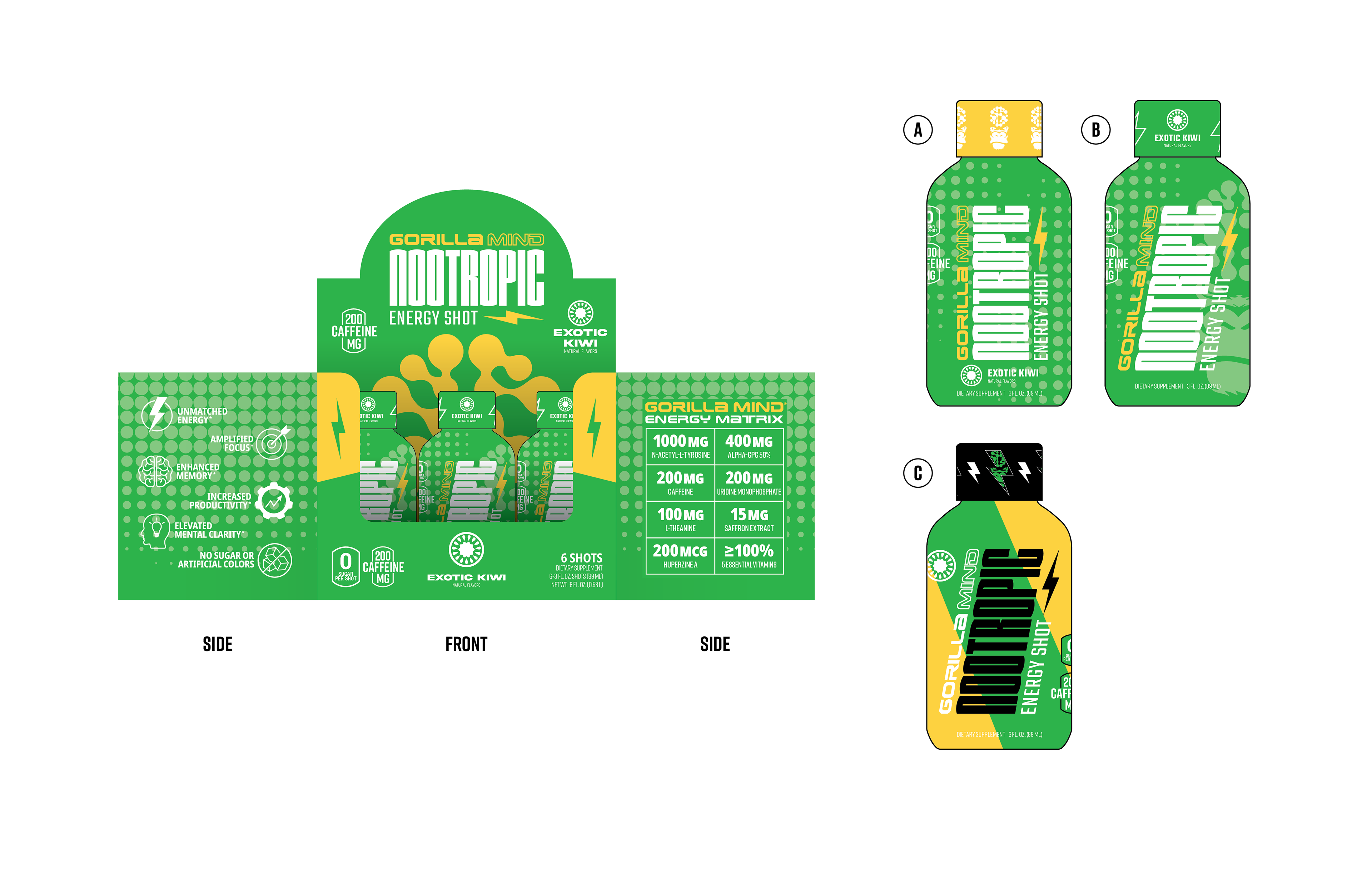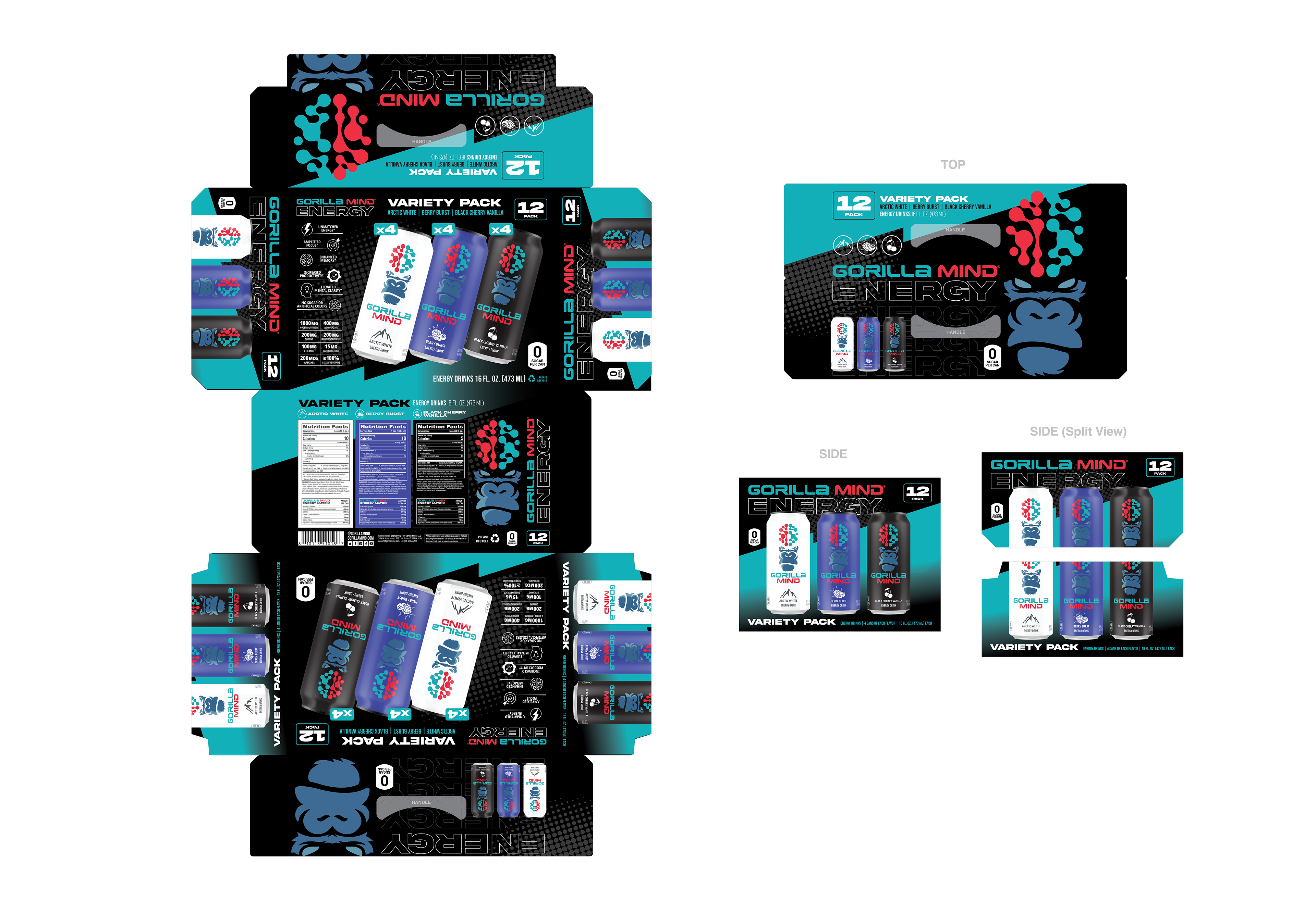 Designed a wide range of Gorilla Mind packaging across formats and retail environments, including 12-pack and 18-pack club packaging for Costco, whey protein, and creatine gummies with tactile finishing explorations. Led concept development for energy shot sleeves and boxes, balancing shelf impact, scalability, and premium production details.